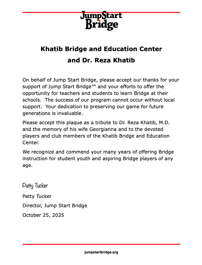 In Spring of 2025 Reza’s Stuart Bridge Center launched its participation in the Jumpstart Bridge Initiative, founded by Grand Master Judy Tucker and operated with the full endorsement of the ACBL. Through an annual endowment now provided by the Khatib Foundation and with the collaborative support of the Center, we hope for great growth potential in Martin and surrounding counties, and Florida at large, as well as any positive assistance the endowment makes to the national Jumpstart Bridge program.