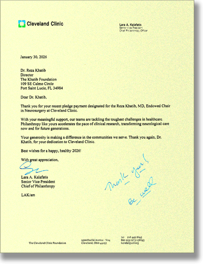 Dr. Khatib’s collaborations have put in place with Johns Hopkins University, Case Western Reserve University, and The Cleveland Clinic. Those contracts are designed to continue, in perpetuity, endowed chair research positions with each partner. Top medical practitioners from their respective departments of neurology & neurosurgery are participants in these programs. The Foundation projects have been thoughtfully designed to carry on their important missions well into the future.