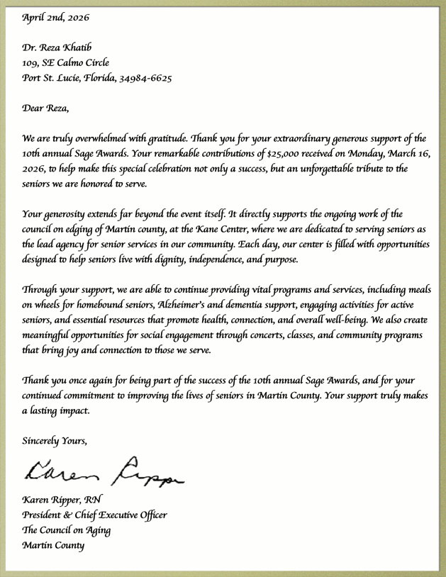Beginning in 2017, for his lifelong work, Dr. Reza Khatib was honored by the Martin County Council on Aging’s Kane Center for extraordinary philanthropic support with his appointment as 2017’s recipient of the Sage Award in Medicine. His late wife Georgianna was also an attendee; It was her last major honor Georgie and Reza received before her passing in 2023.